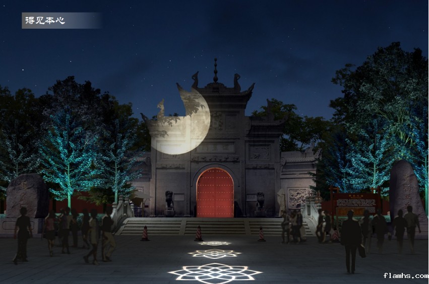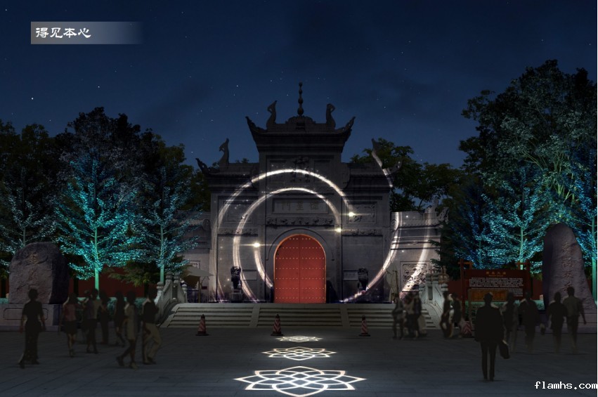 (5)在大庙正门前拟安装激光投影机与庄严肃穆的环境不协调。南岳大庙是著名宗教场所,南岳大庙正门一直以来庄严肃穆。我们通过现场了解发现,晚上的南岳大庙正门及周边,灯光明亮,行人稀少,店铺闭门。在大庙正门拟安装投影机并配置音响需要投资240多万元。改造后的大庙正门效果图富有小资情调,一改南岳大庙正门特有的庄严肃穆形象,与南岳大庙整体环境不协调。拟改造后大庙正门效果图如下所示: