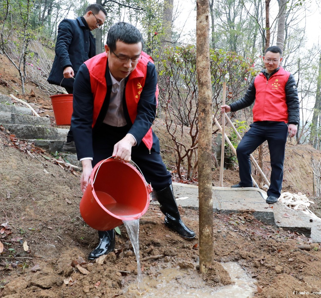 一到种植点,志愿者们有的拿锄头、有的拿铁锹、有的提水桶,按照分工,三人一组,认领要种的树苗,打窝的打窝、扶苗的扶苗、填土的填土、浇水的浇水,你一锹我一铲、你种树我浇水,密切配合,干劲十足,呈现一派繁忙的景象。大家发扬不怕苦不怕累的精神,在这片“清风林”种下廉洁的“树苗”,浇灌廉洁的“清水”,经过近两个小时的奋战,一棵棵玉兰树、梅花树、松柏、红枫、映山红、红豆杉、金丝楠迎风招展,“清风林”新添了一丛“新绿”。
