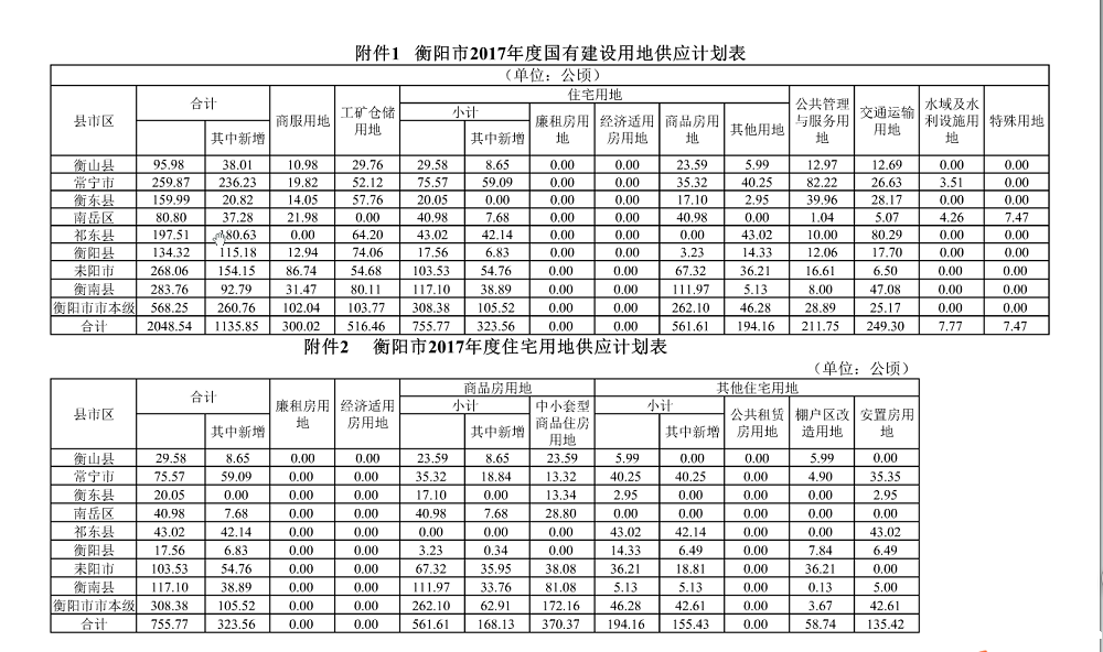 2017年衡阳市供地计划汇总表