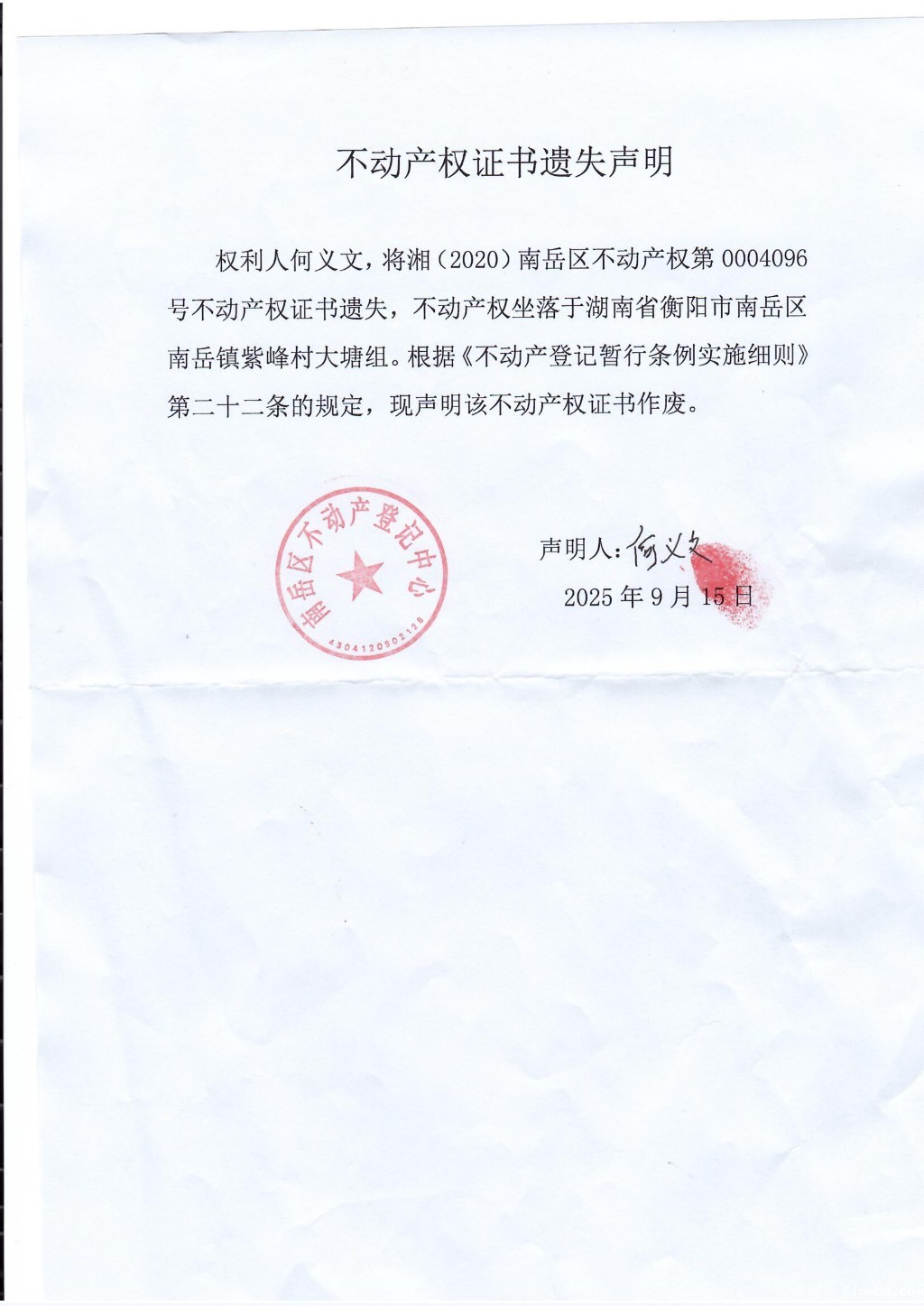 不动产权证书遗失声明(何义文)
