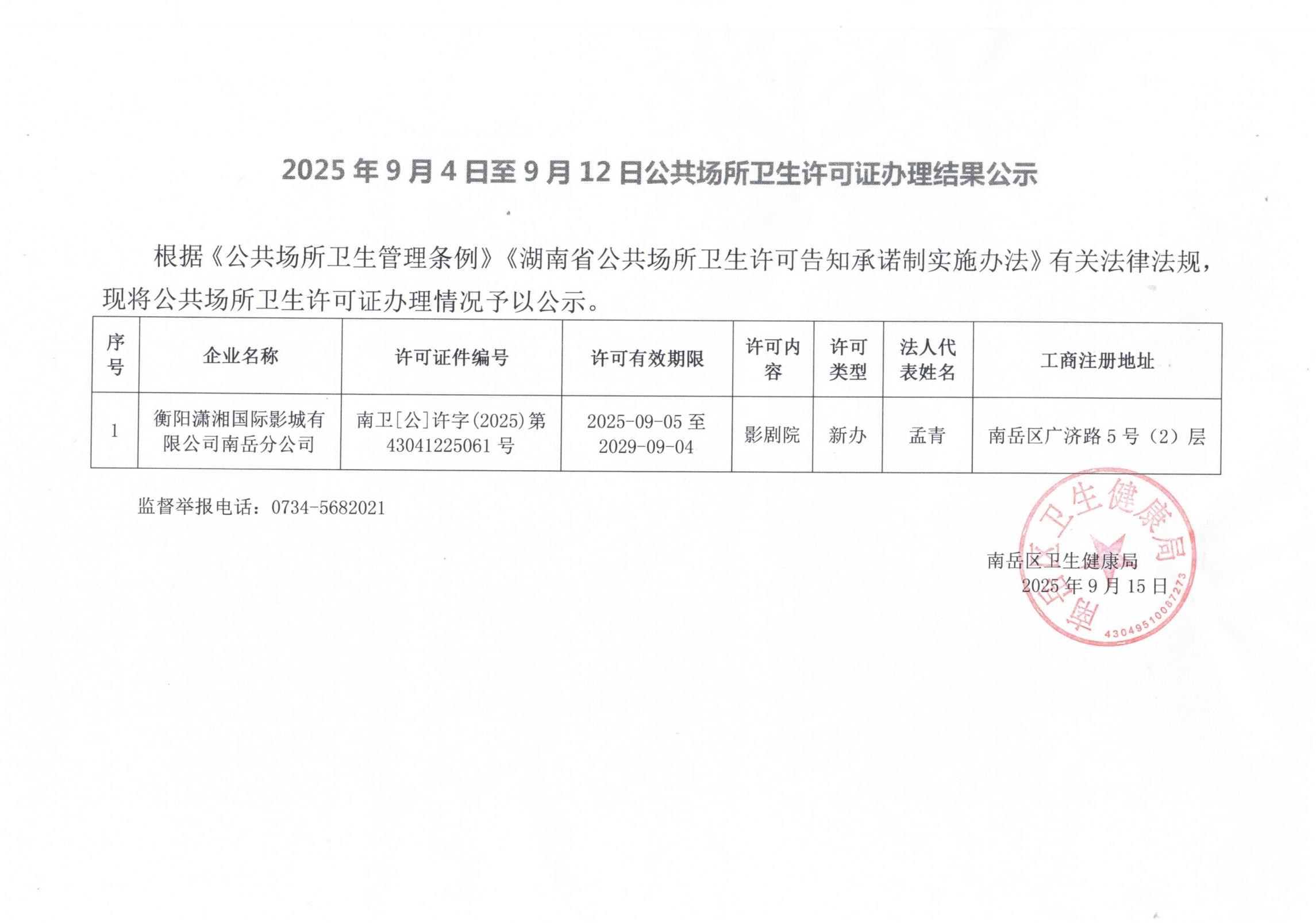 2025年9月4日至9月12日公共场所卫生许可证办理结果公示