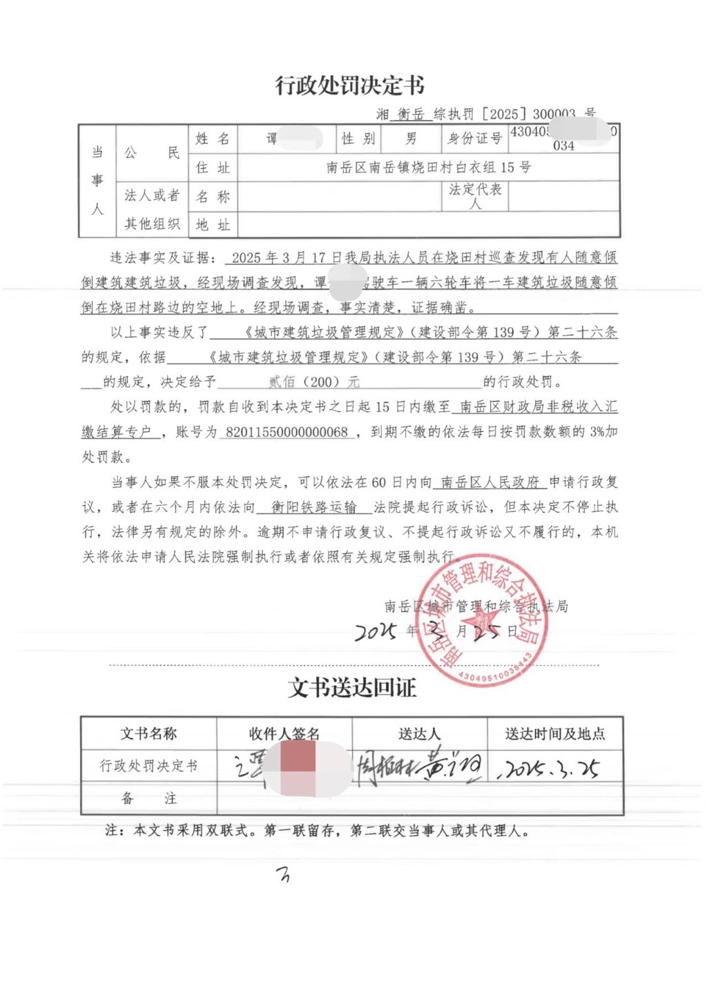 2025年3月17日,点点移动端下载城市管理和综合执法局渣土中队的队员发现谭某某在点点移动端下载烧田村随意倾倒建筑垃圾,依据《城市建筑垃圾管理规定》第二十六条的规定,谭某某被依法查处。