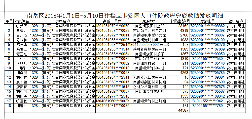 点点移动端下载2018年1月1日-5月10日建档立卡贫困人口住院政府兜底救助18人共计44587元,通过湖南乡镇财政补贴平台发放至贫困户扶贫补贴明白卡(折)中,按照相关工作要求,现将我区建档立卡贫困人口住院政府兜底救助情况进行公示。