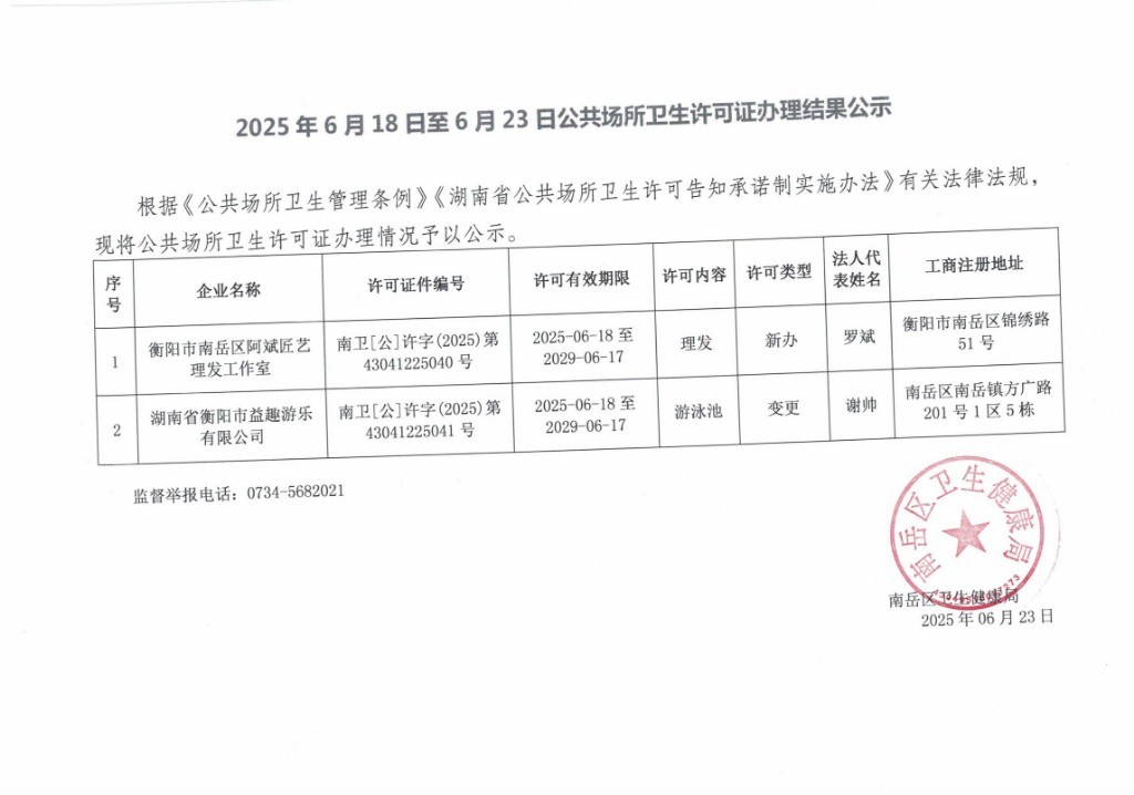2025年6月18日至6月23日公共场所卫生许可证办理结果公示