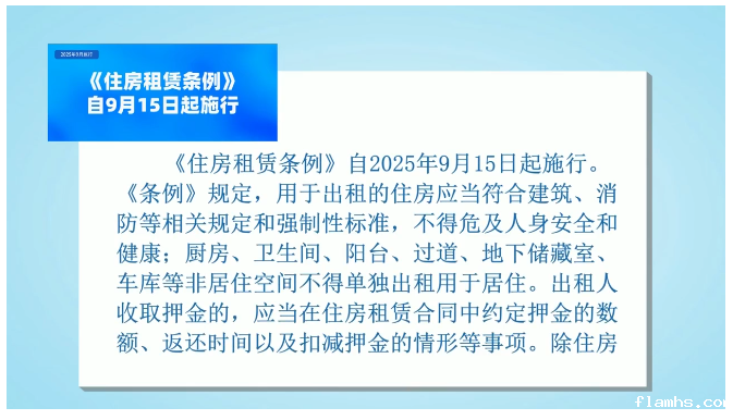 《住房租赁条例》自2025年9月15日起施行。《条例》规定,用于出租的住房应当符合建筑、消防等相关规定和强制性标准,不得危及人身安全和健康;厨房、卫生间、阳台、过道、地下储藏室、车库等非居住空间不得单独出租用于居住。出租人收取押金的,应当在住房租赁合同中约定押金的数额、返还时间以及扣减押金的情形等事项。除住房租赁合同约定的情形以外,出租人无正当理由不得扣减押金。发布的房源信息应当真实、准确、完整,不得发布虚假或者误导性房源信息,不得隐瞒或者拒绝提供拟出租住房的有关重要信息。